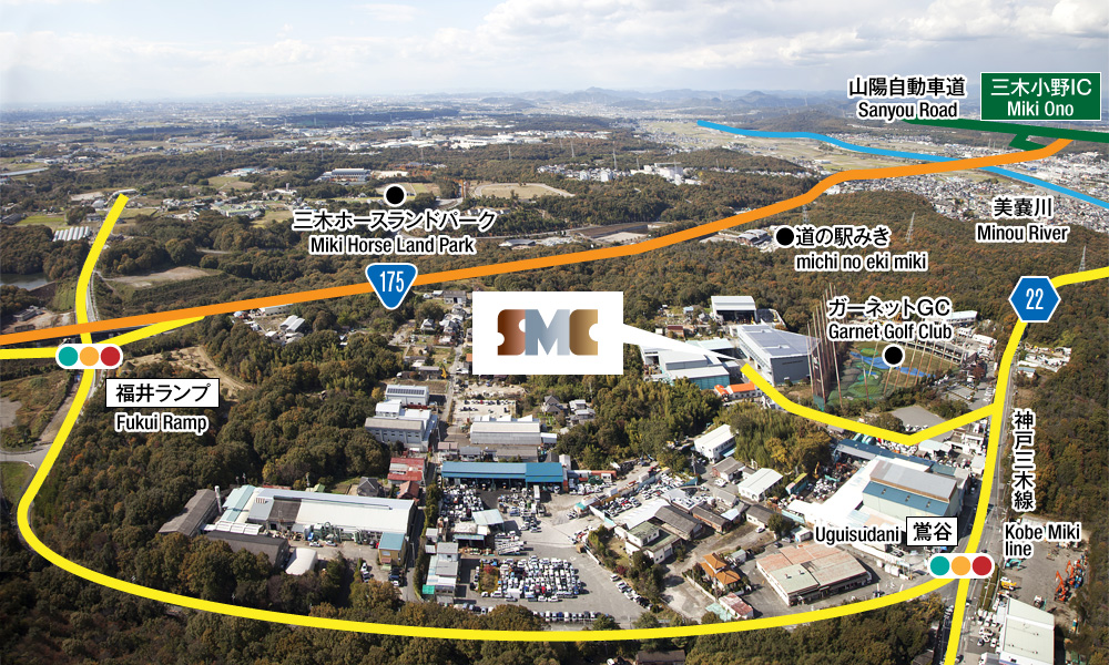 Go north on route 175 past the Kobayashi intersection towards [Kakogawa Miki city], then go along the side road and turn right at the Fukui Ramp intersection. Then go past the Uguisudani intersection about 150 meters and you will see our sign and entrance on the left.